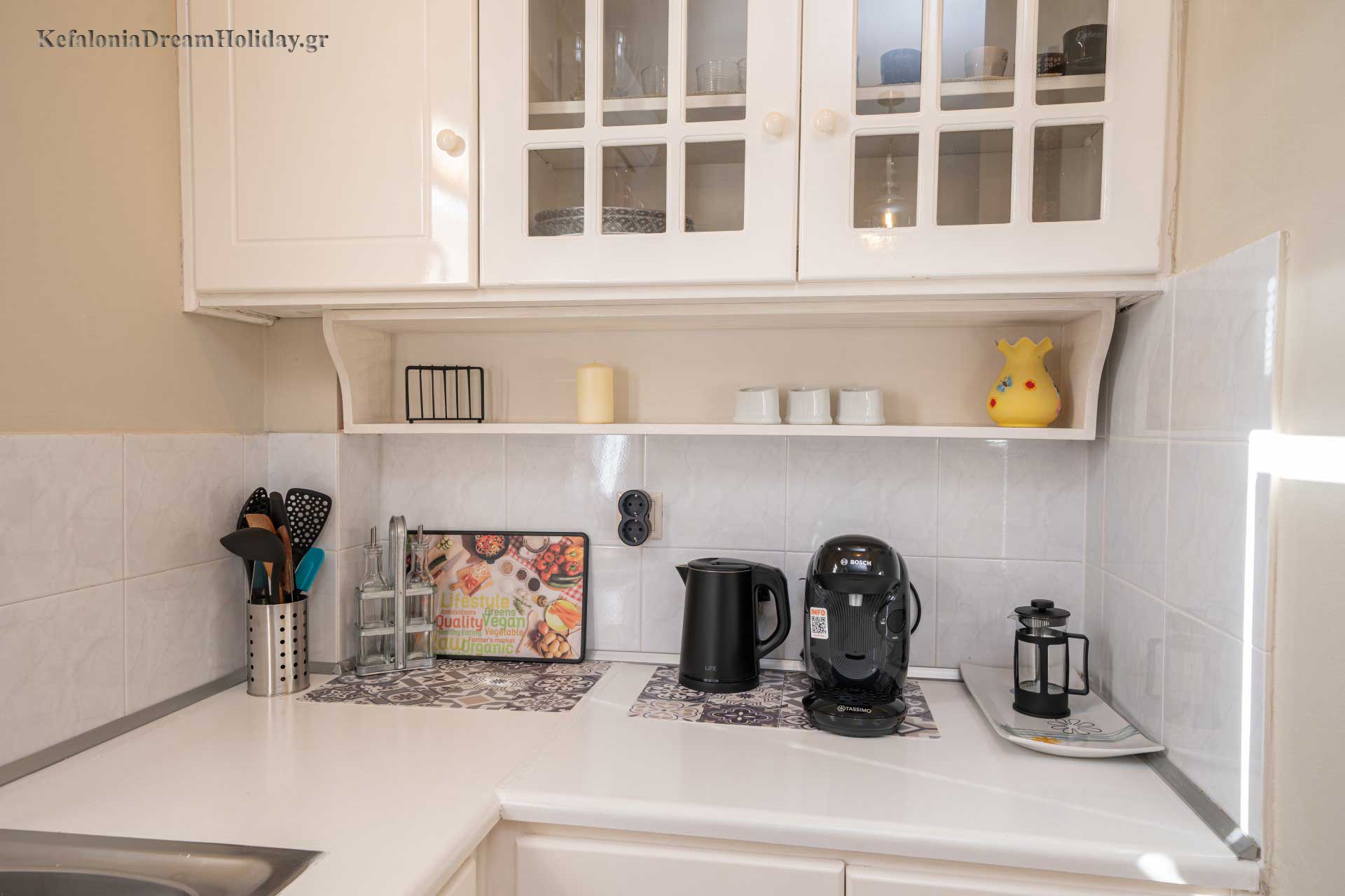 KITCHEN ): Refrigerator, freezer, oven, stovetop, coffee maker, electric kettle, kitchenware, dishes & utensils.
