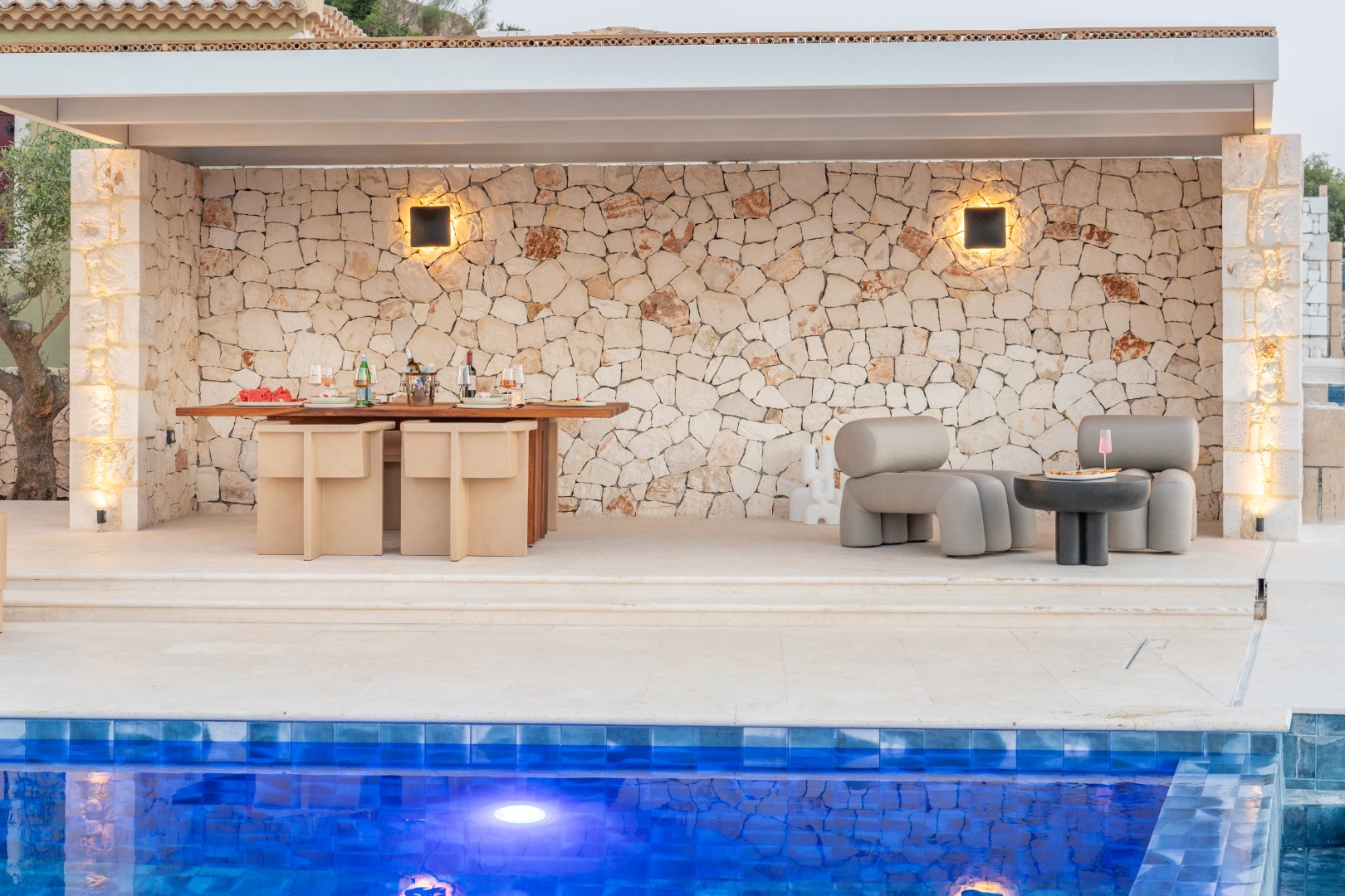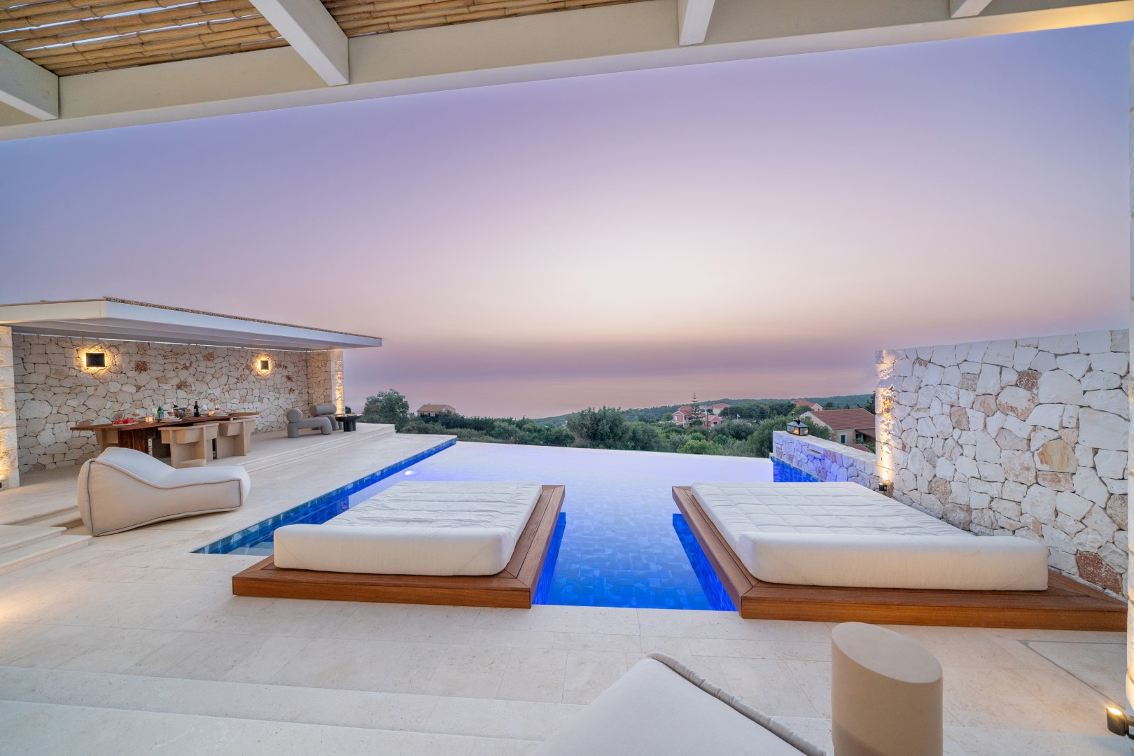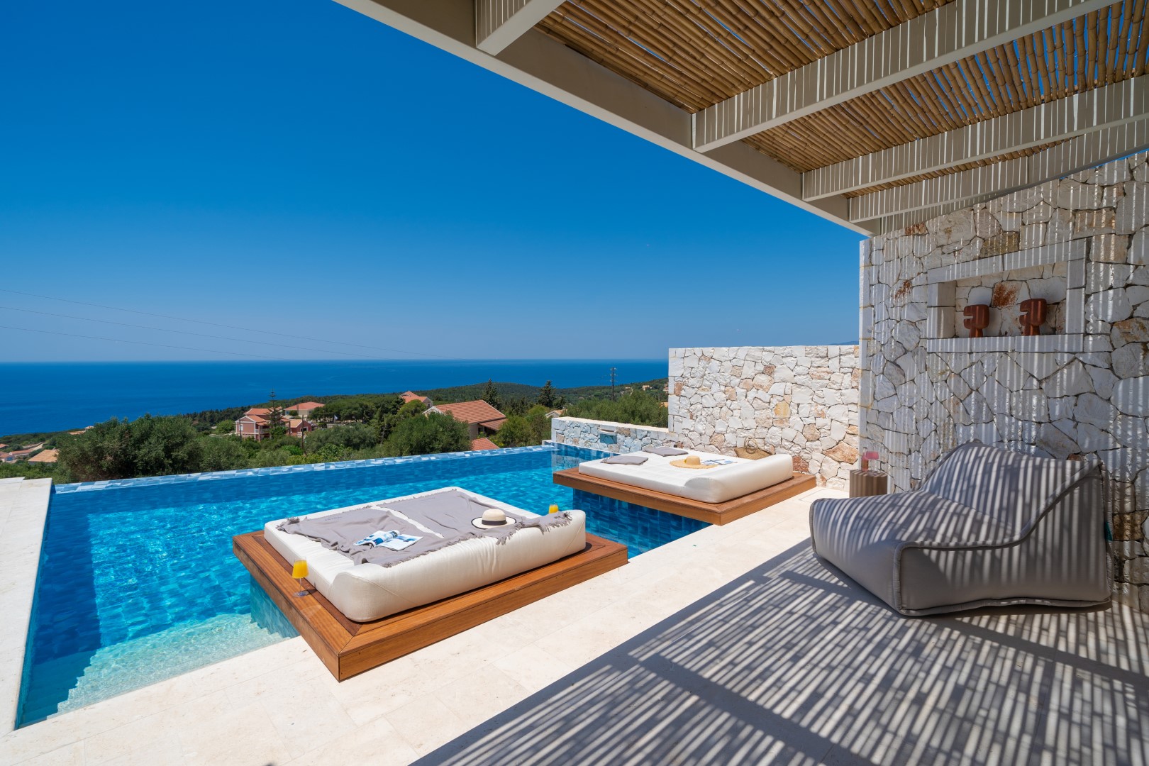OUTDOORS: Gorgeous terrace with dining area, loungers and umbrellas, infinite swimming pool with jacuzzi, open poolside shower, BBQ.