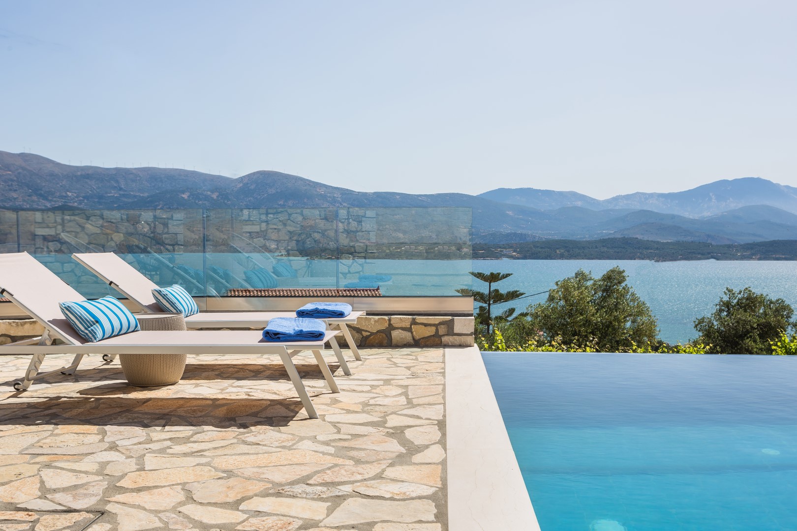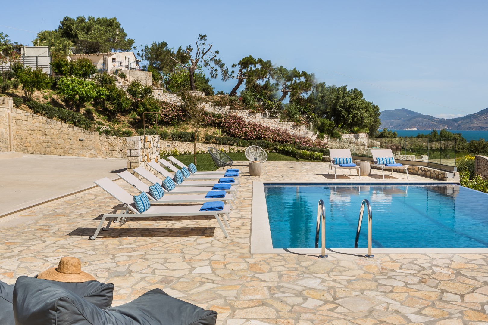 OUTDOORS: Breathtaking sea views, loungers and umbrellas, infinite swimming pool, open poolside shower, BBQ, well cared garden, shared washing machine,.